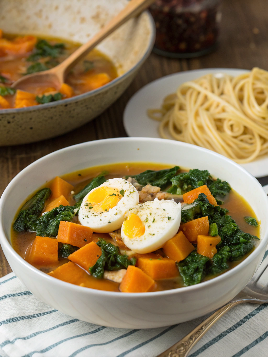 This nutrient-packed soup brings together the earthy flavors of kale, the sweetness of sweet potatoes, and the comfort of pasta in one hearty bowl. The crowning glory is the perfectly poached egg that, when broken, creates a luscious, silky sauce that enriches the entire soup. This complete meal-in-a-bowl is perfect for those nights when you want something nourishing that feels special.
