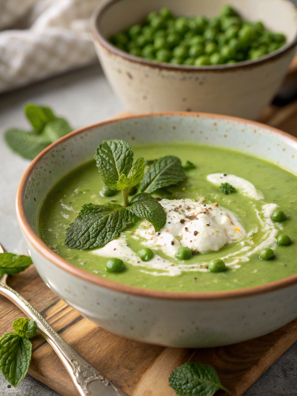 This vibrant green pea soup celebrates spring with its fresh, sweet flavors and velvety texture. The bright mint adds a refreshing note while the dollop of crème fraîche provides luxurious creaminess that takes this simple soup to elegant heights. Ready in just 20 minutes, this soup is perfect for busy weeknights when you want something special without the fuss.
