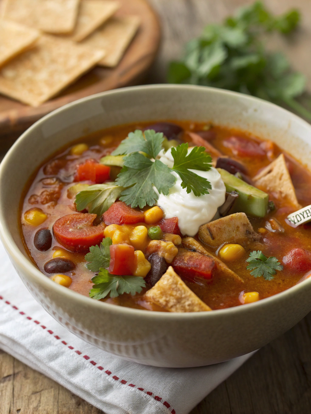 This vibrant vegetarian tortilla soup brings the bold flavors of Mexican cuisine to your table without the meat. The rich tomato broth is infused with smoky chipotle, cumin, and oregano, creating a flavorful base for beans, corn, and colorful vegetables. Topped with crispy tortilla strips, avocado, and lime, this soup offers a perfect balance of textures and tastes that will satisfy even dedicated carnivores.
