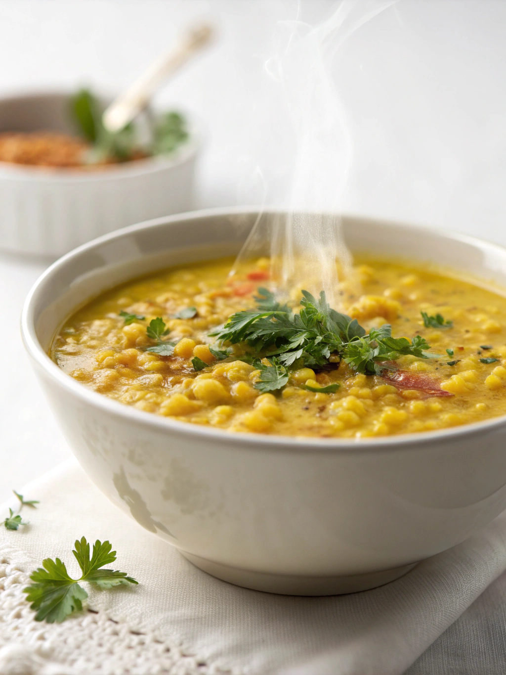 This sunny yellow split pea soup offers a lighter, brighter alternative to traditional green split pea soup, with a slightly sweeter flavor and vibrant golden color. The split peas break down as they cook, creating a naturally thick, creamy texture without any dairy. Economical and nutritious, this soup is perfect for batch cooking and actually improves with flavor after a day in the refrigerator.