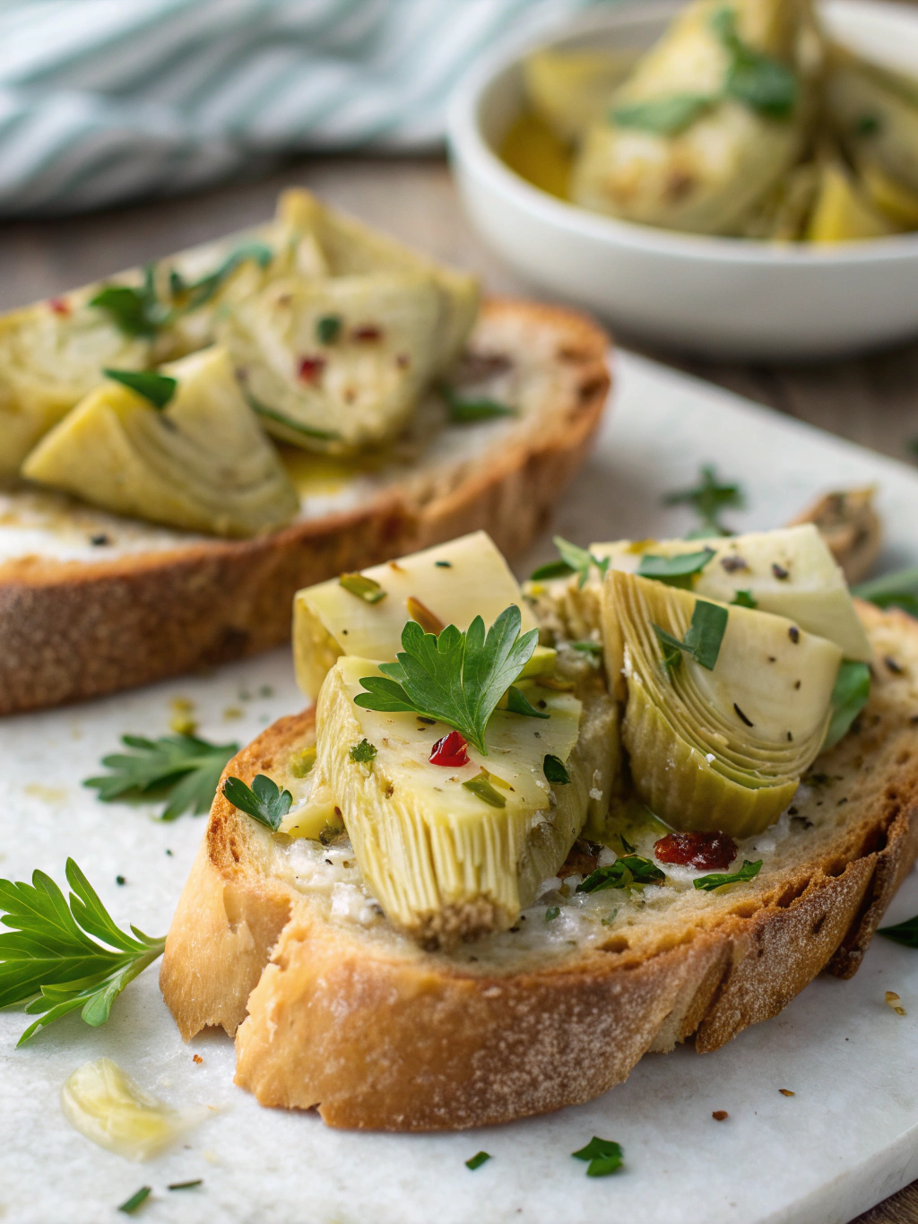 Excess liquid creates soggy bruschetta. Press artichokes between paper towels to remove extra moisture for a more concentrated flavor.