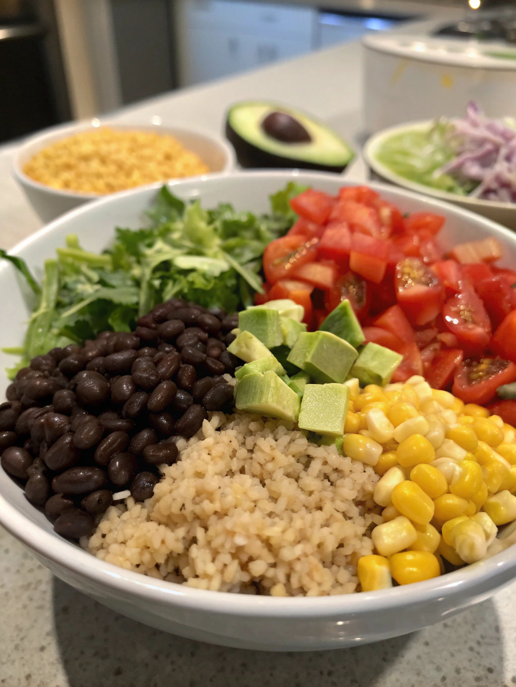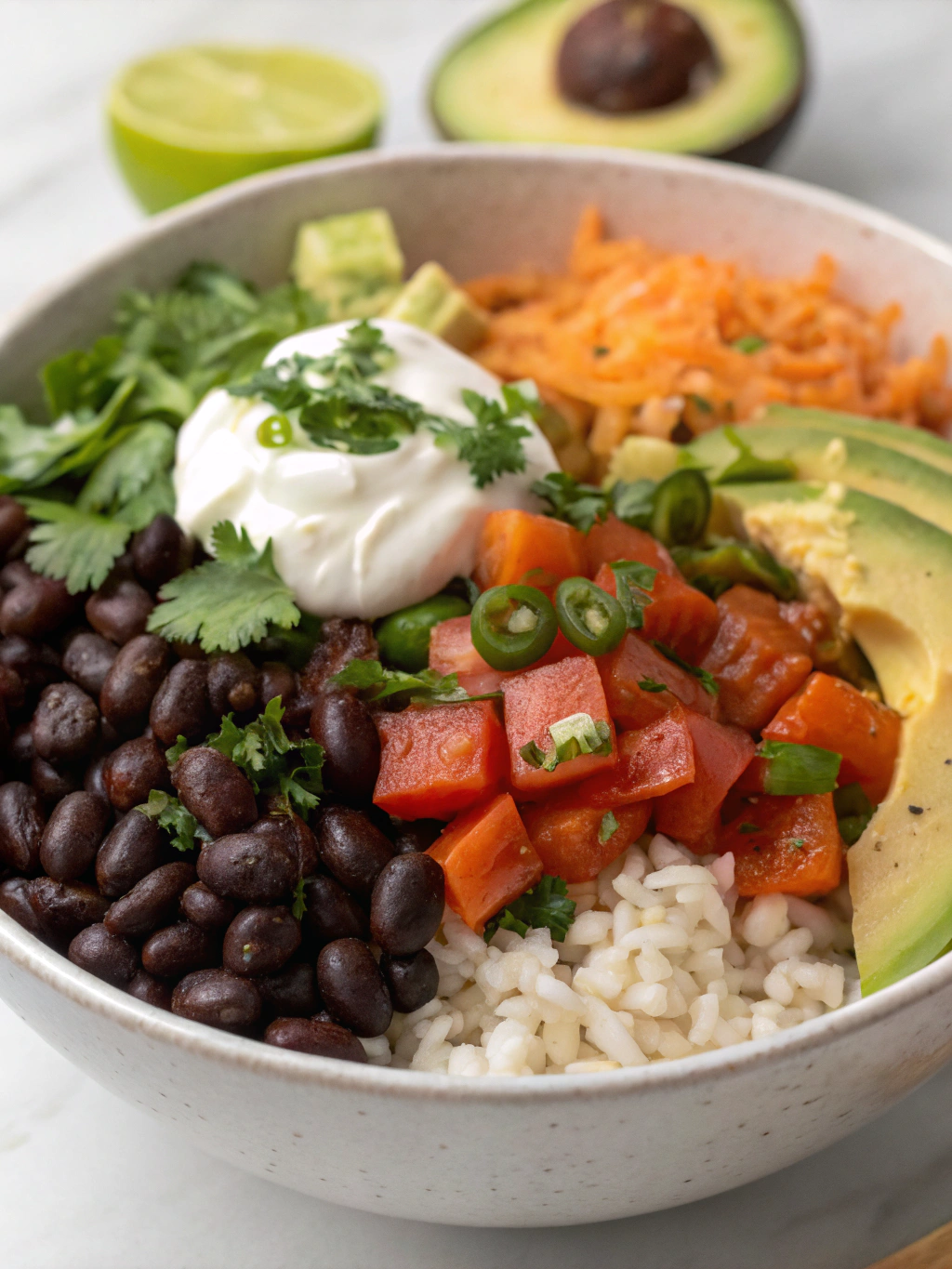 - Start with a base of cilantro-lime rice in each bowl. Top with a generous portion of the seasoned black beans. Arrange your fresh toppings in sections around the bowl for a visually appealing presentation.