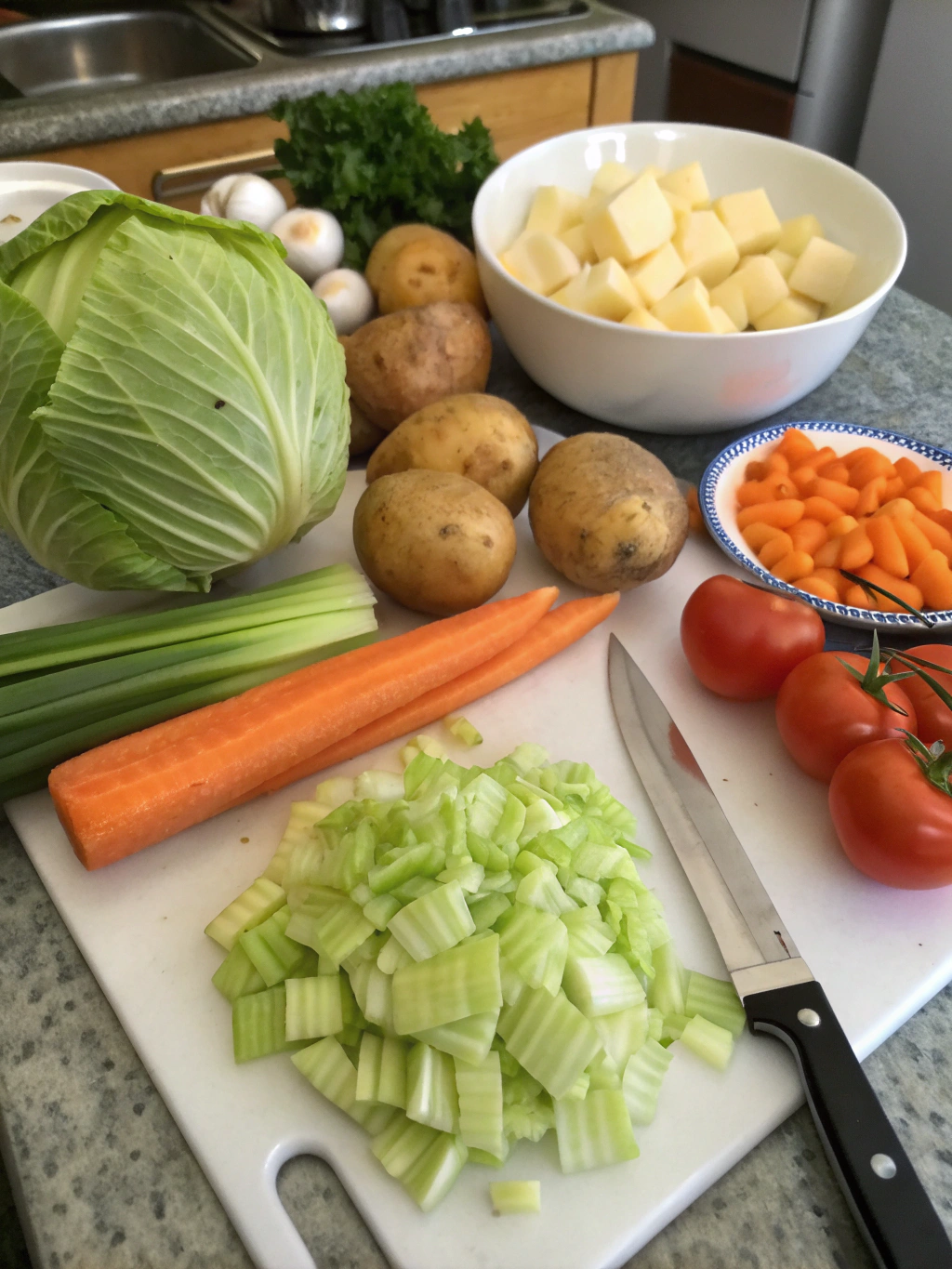 Thoroughly wash all vegetables. Chop cabbage into 1-inch pieces, dice onions, slice carrots, chop celery, and mince garlic. Pro tip: Cutting cabbage into consistently sized pieces ensures even cooking and better texture absorption—a mistake made by 62% of home cooks according to culinary surveys.