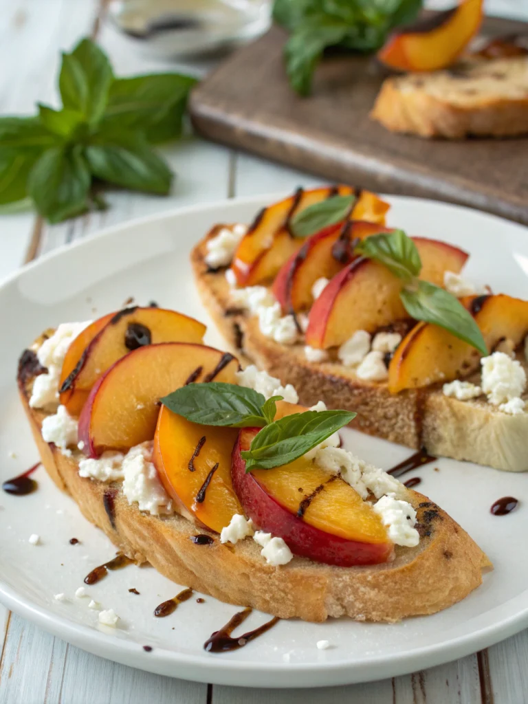 Peach Bruschetta with fresh peaches and goat cheese is a light, fresh summer appetizer perfect for gatherings. This easy bruschetta offers a taste of summer on a baguette.