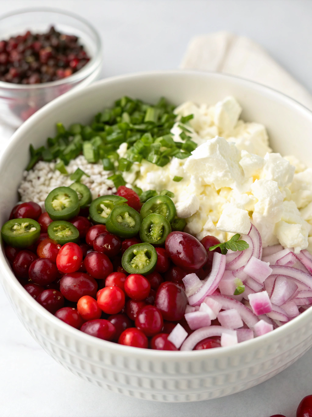 In a medium bowl, mix the chopped cranberries with the diced jalapeños, green onions, and cilantro. This is where the magic happens—the bright acidic cranberries meet the heat of jalapeños and the freshness of herbs. For milder palates, remember that removing jalapeño seeds and membranes reduces heat by approximately 80%.