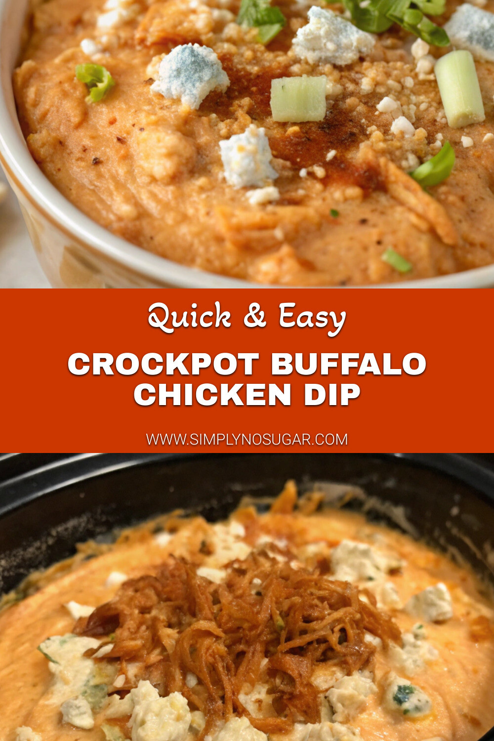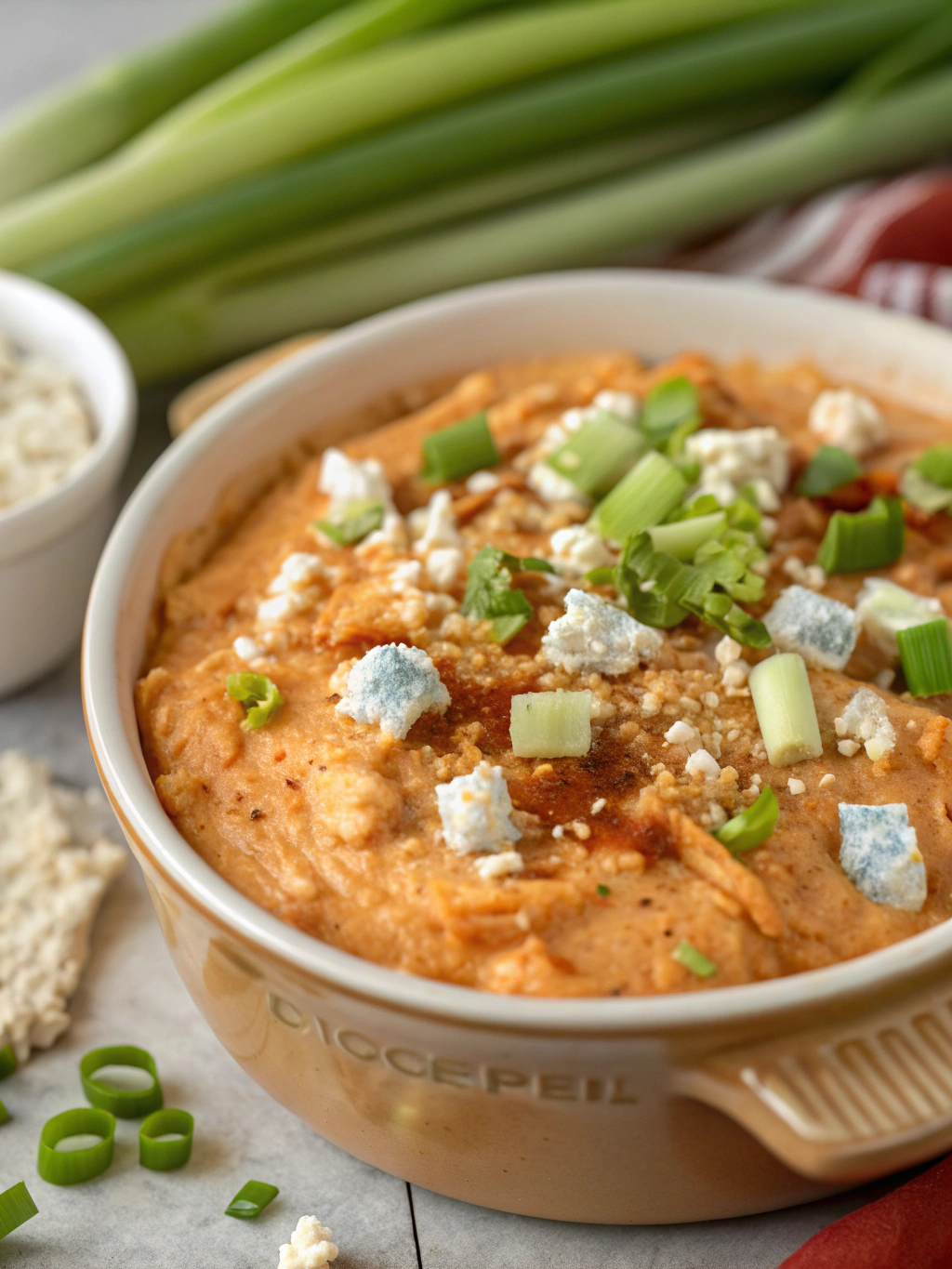 For an elevated presentation, serve the dip in the crockpot set to WARM with dippers arranged in a circular pattern around it. Garnish with extra sliced green onions, a drizzle of Buffalo sauce, and fresh cilantro for a pop of color.