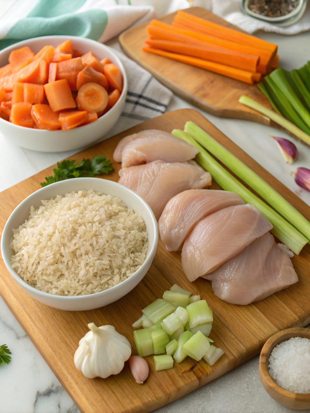 - Sprinkle the diced onion, carrots, celery, and minced garlic over the chicken. Add the rinsed rice on top, spreading it evenly.