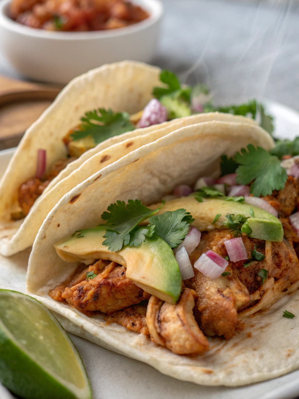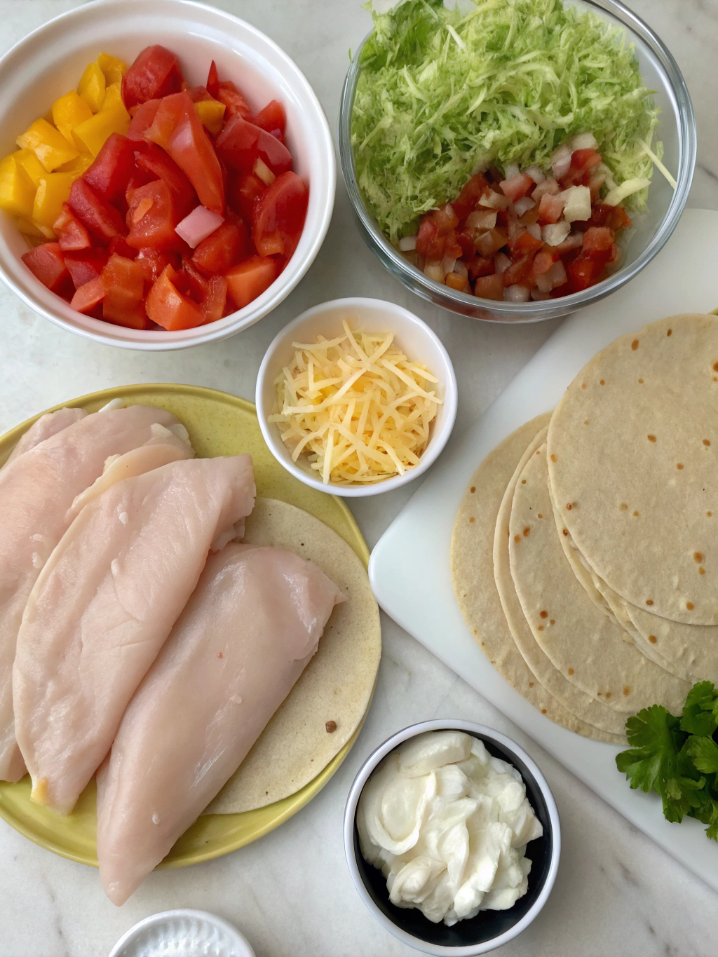 - Traditional Style: Warm corn or flour tortillas topped with shredded chicken, diced tomatoes, lettuce, cheese, and a dollop of Greek yogurt.