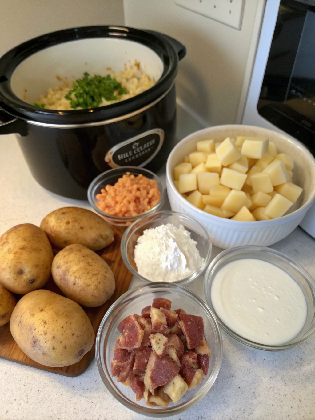 Begin by placing your peeled and diced potatoes, diced onion, and minced garlic in the crockpot. Pour in the chicken broth, making sure the liquid covers the potatoes. This creates the foundation of flavors that will develop throughout the cooking process. Pro tip: Cut potatoes into uniform pieces to ensure they cook evenly – inconsistent sizes can lead to some pieces being overcooked while others remain undercooked.