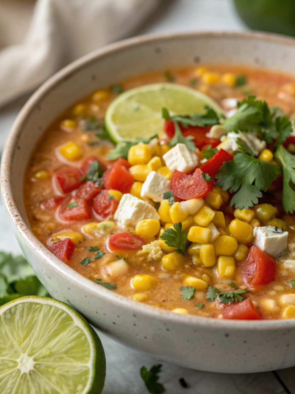 Ladle the soup into bowls and top with crumbled cotija cheese, remaining cilantro, a lime wedge, and an optional sprinkle of additional chili powder. For an authentic elote experience, consider offering toppings like Mexican crema, sliced avocado, or crushed tortilla chips for added texture.