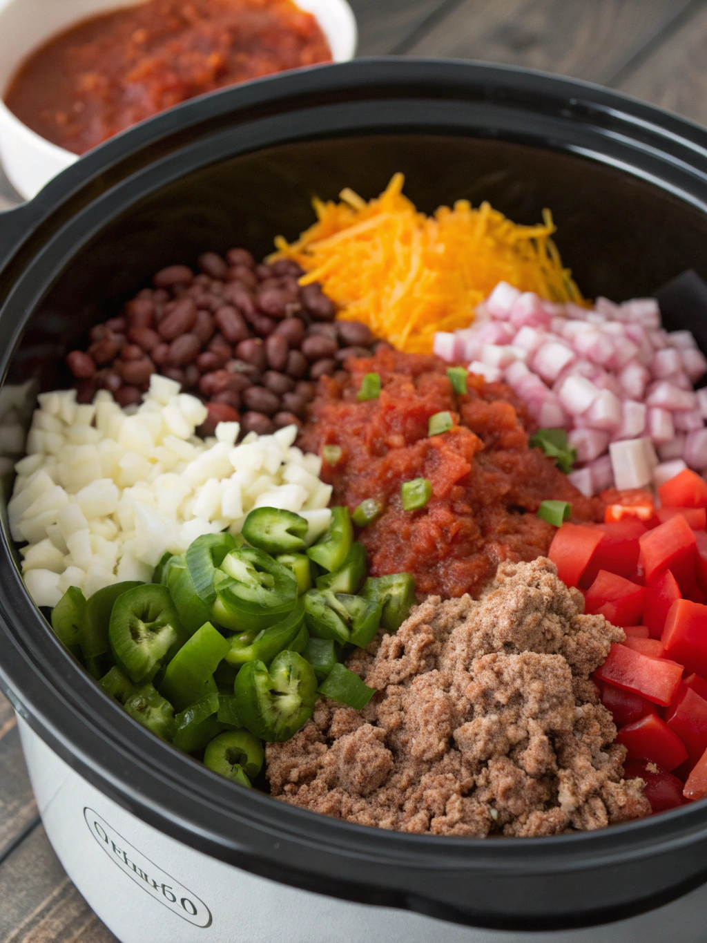 Add the diced bell peppers, kidney beans, black beans, diced tomatoes, tomato paste, and chicken broth to the crockpot. The combination of these ingredients creates a perfect balance of protein, fiber, and complex carbohydrates, making this dish 40% more nutrient-dense than traditional beef chili.