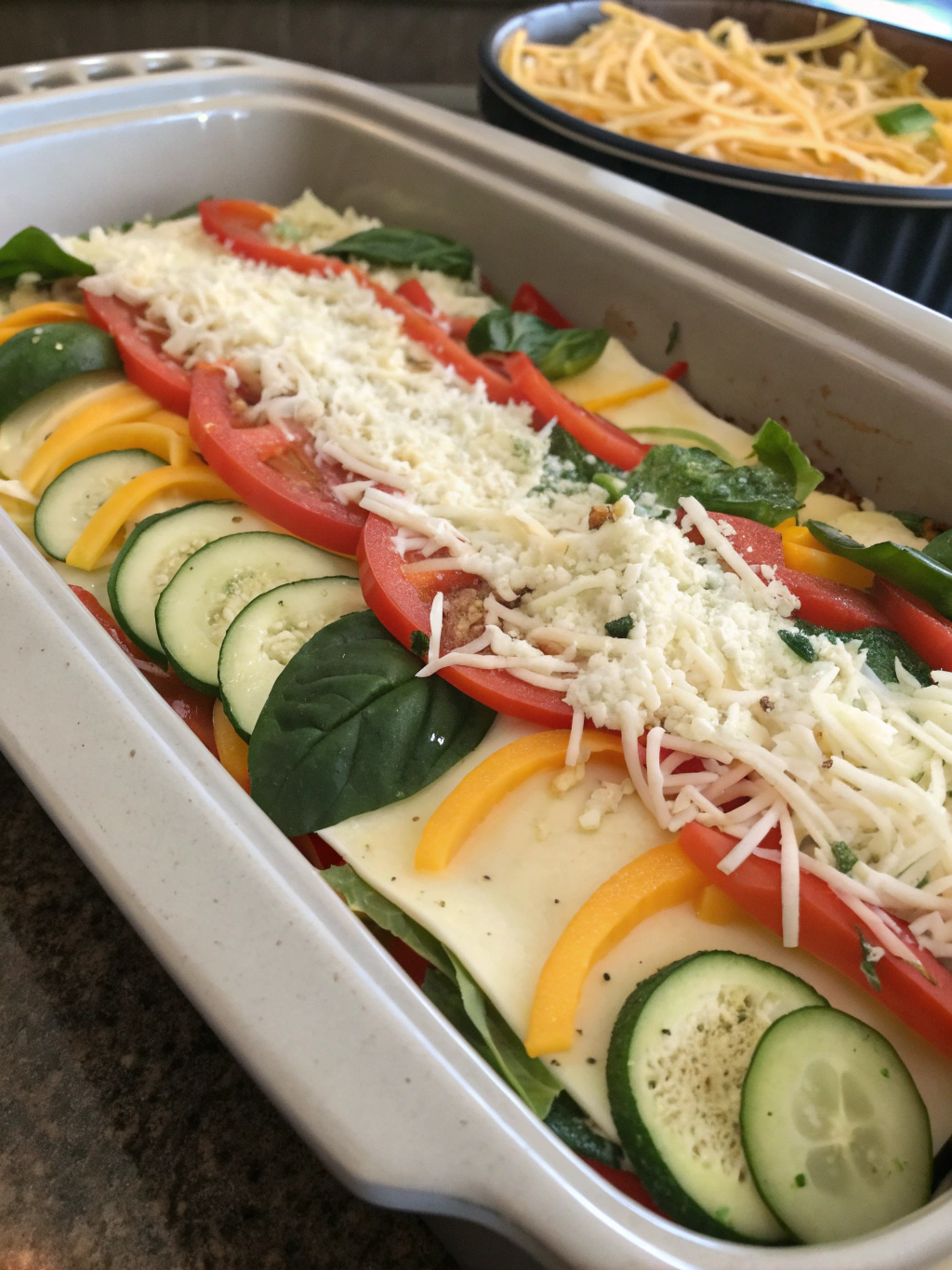 Add 1/3 of the cheese mixture on top of the noodles, spreading evenly. Layer 1/3 of the vegetable sauce over the cheese, then add a layer of fresh spinach. Repeat the layering process (noodles, cheese mixture, sauce, spinach) two more times, ending with a final layer of sauce on top.