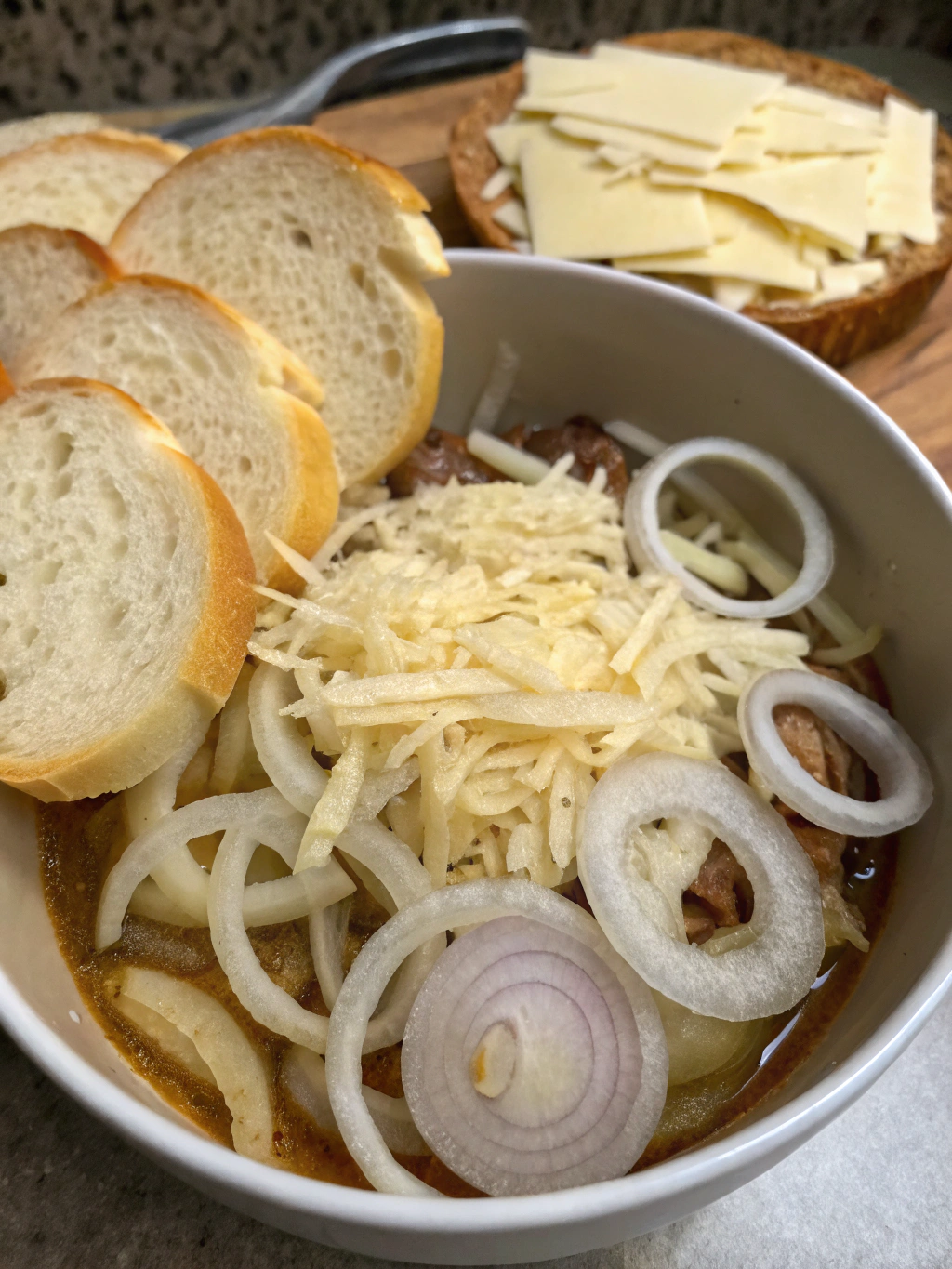 - Ladle hot soup into oven-safe bowls placed on a baking sheet. Float 1-2 toasted bread slices on top of each bowl. Generously cover with a combination of grated Gruyère and Parmesan.