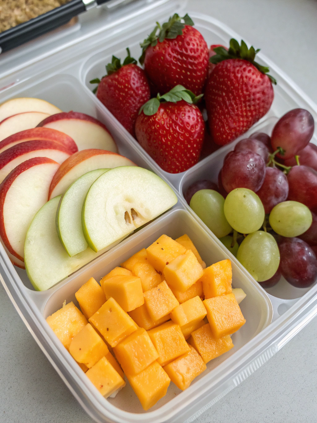 - “Breakfast for Lunch” twist: Add mini whole grain waffles (cut into quarters), yogurt dip, and granola with the fruit and cheese