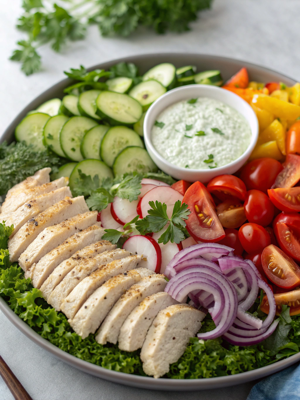 In a large salad bowl or on individual plates, create a bed of chopped romaine lettuce. Arrange the diced cucumber, halved cherry tomatoes, sliced red onion, and kalamata olives on top. Place the sliced chicken in the center of the salad. Sprinkle with crumbled feta cheese and fresh parsley. For meal prep, consider arranging components in sections rather than mixing for maximum freshness.