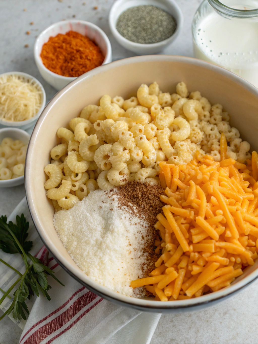 Add mustard powder, cayenne (if using), garlic powder, salt, and pepper. These ingredients enhance the cheese flavor without overwhelming it. Mustard powder contains compounds that help emulsify the cheese for a smoother texture.