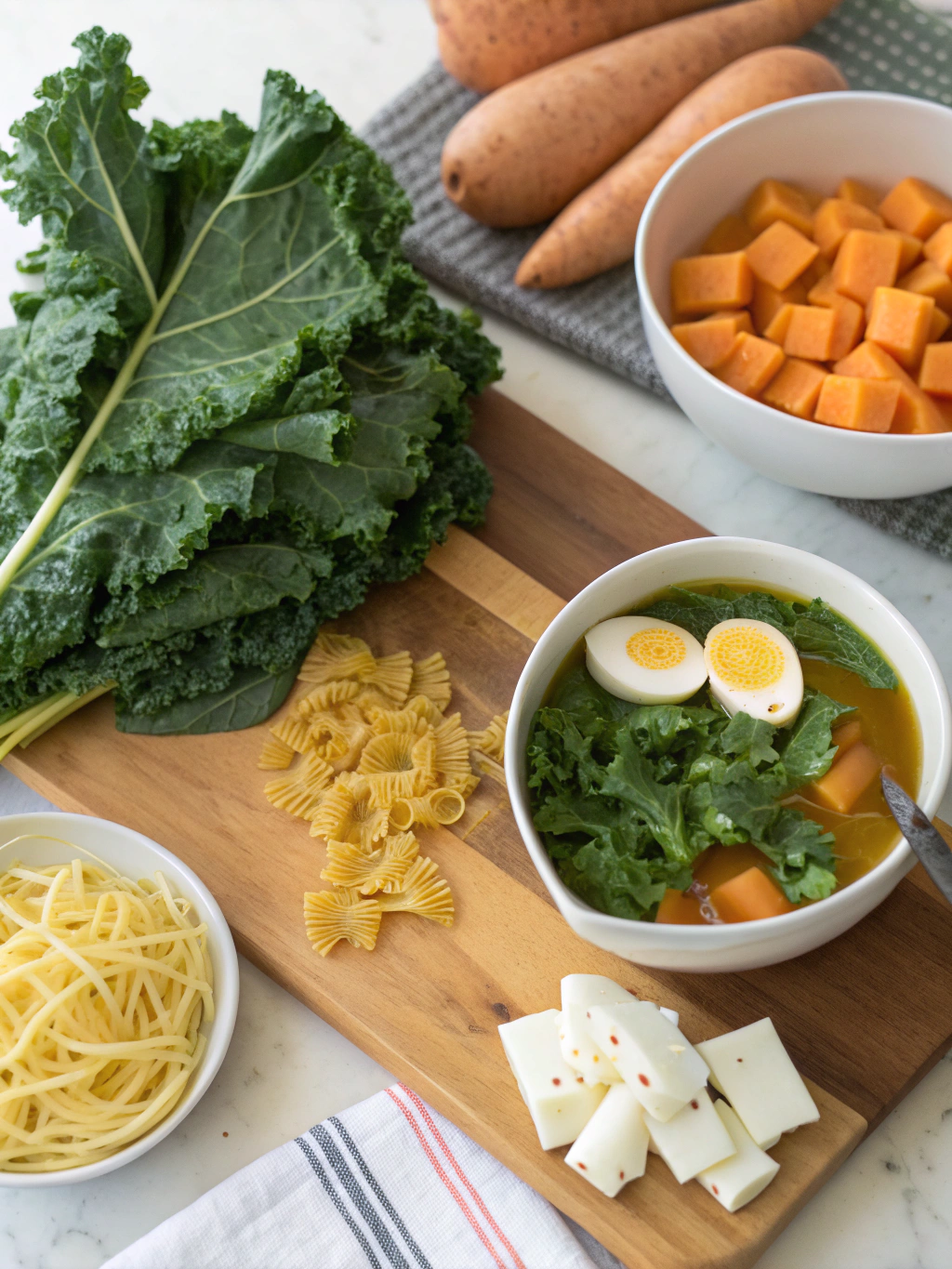 Ingredients List for Kale and Sweet Potato Soup with Pasta and Poached Eggs