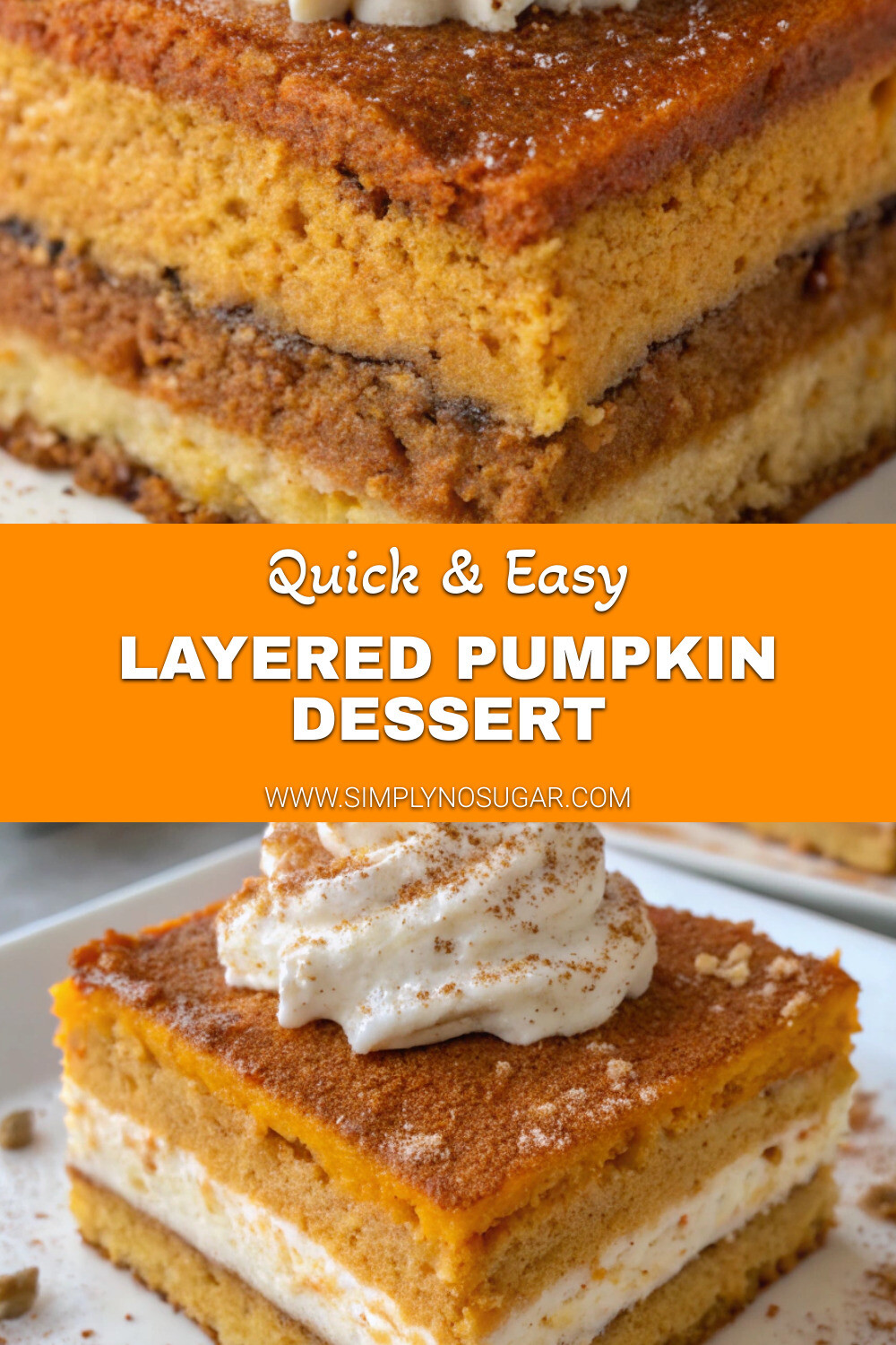 - Spread the whipped cream over the set pumpkin layer, creating decorative swirls with the back of a spoon if desired.
