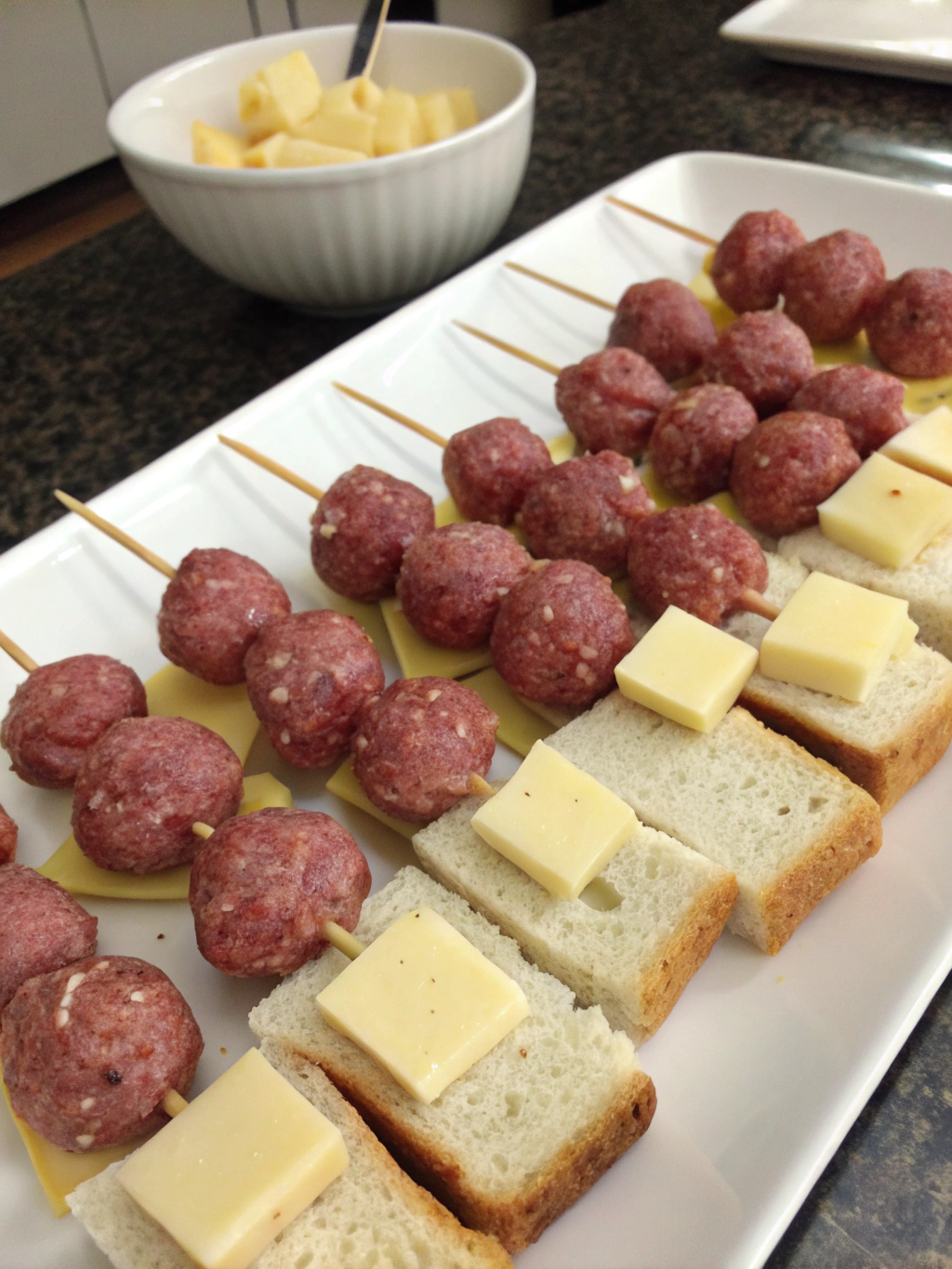 - Take each wooden skewer and thread on components in this order: bread cube, meatball, cheese cube, bread cube.