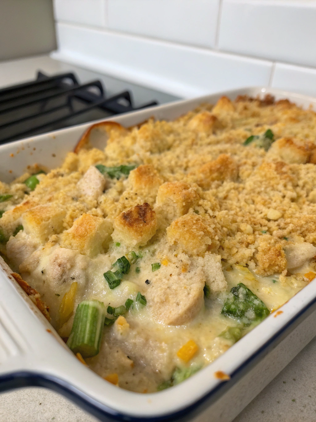 Add the remaining chicken mixture on top of the cheese layer. Sprinkle with the remaining cup of cheddar cheese, followed by the crumbled bacon and green onions. In a small bowl, mix the crushed Ritz crackers with melted butter, then sprinkle this topping evenly over the casserole. The crackers should just barely touch – avoid packing them down to maintain that perfect crunch.