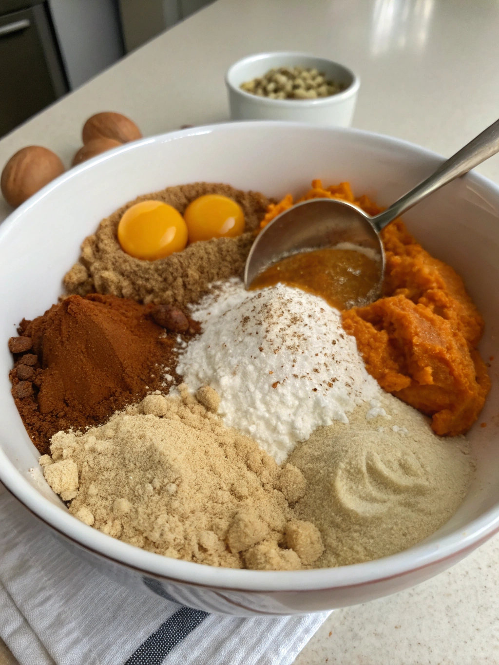 - In a separate medium bowl, whisk the eggs until lightly beaten. Add the pumpkin puree, maple syrup or honey, melted coconut oil, milk, and vanilla extract. Mix until smooth and well incorporated.