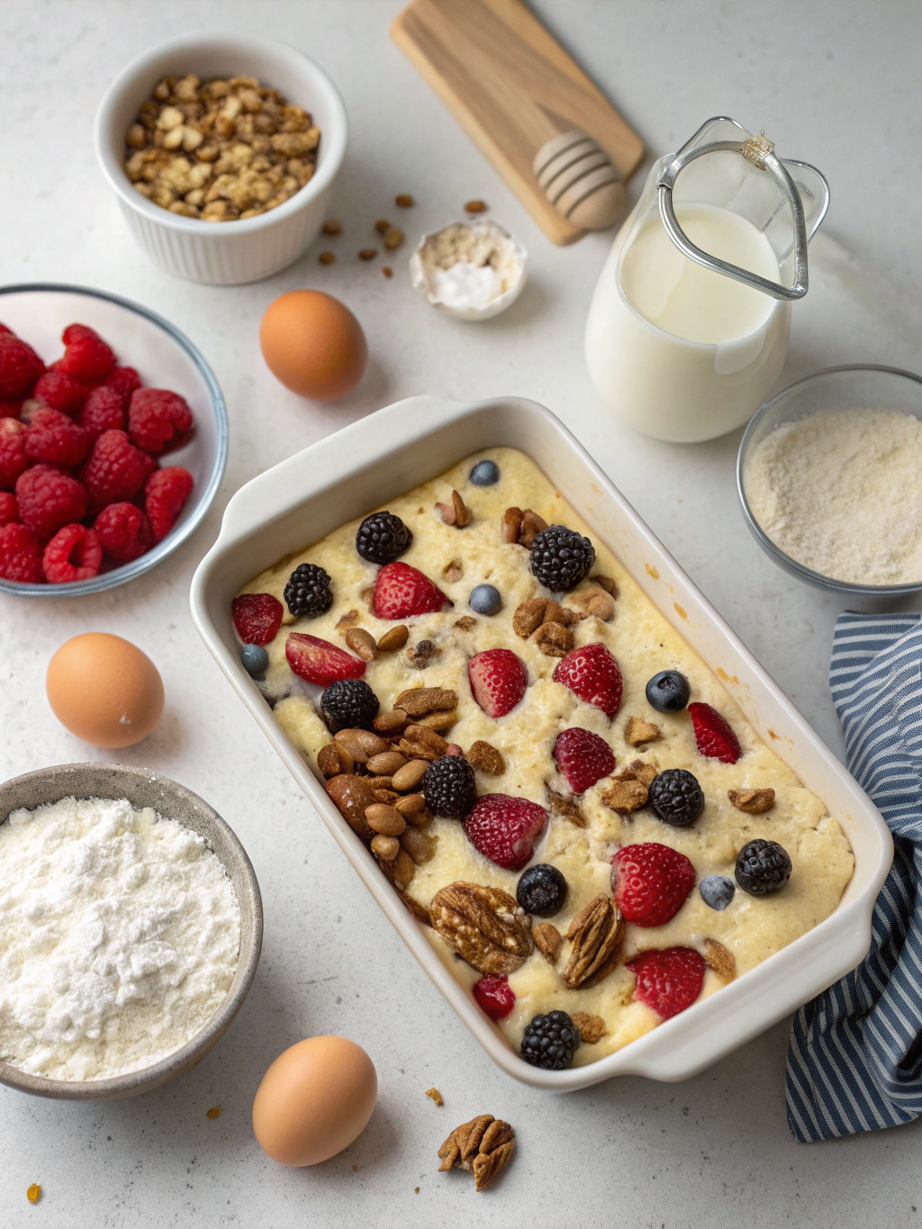 Definitely! Fold in 1-1½ cups of fresh or frozen berries, diced apples, or sliced bananas before baking. If using frozen fruit, don’t thaw first to prevent color bleeding.