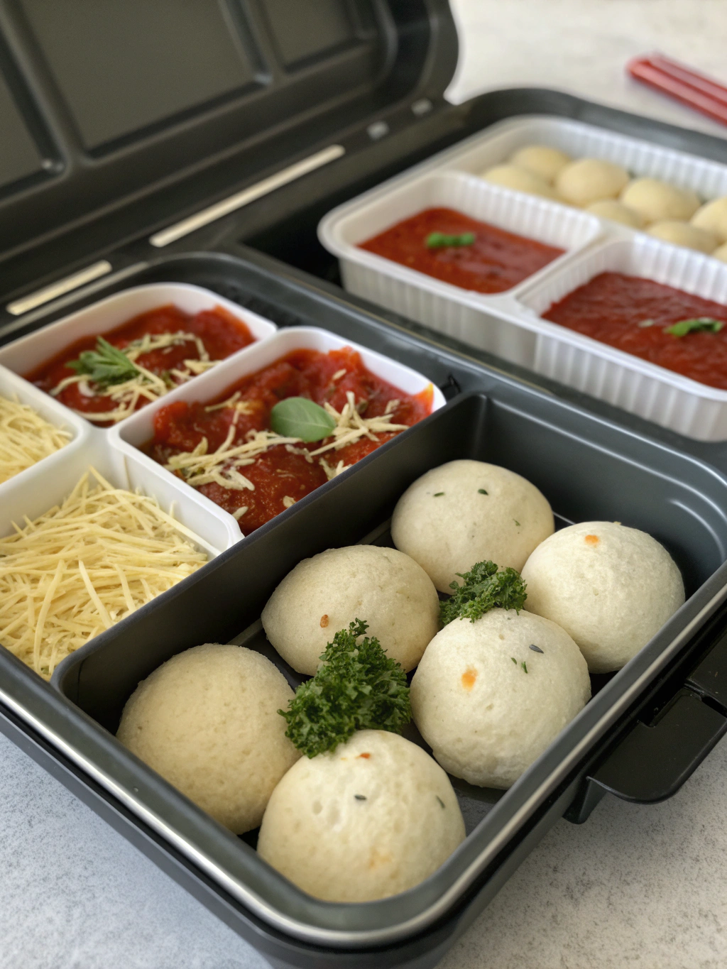 Create a balanced, visually appealing lunch box by arranging 4-5 pizza bites alongside: