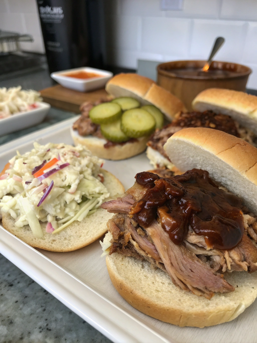 - Lightly toast the brioche buns. Place a generous portion of pulled pork on the bottom half of each bun. Top with coleslaw, pickle slices, and red onion if desired. Drizzle with additional BBQ sauce before adding the top bun.