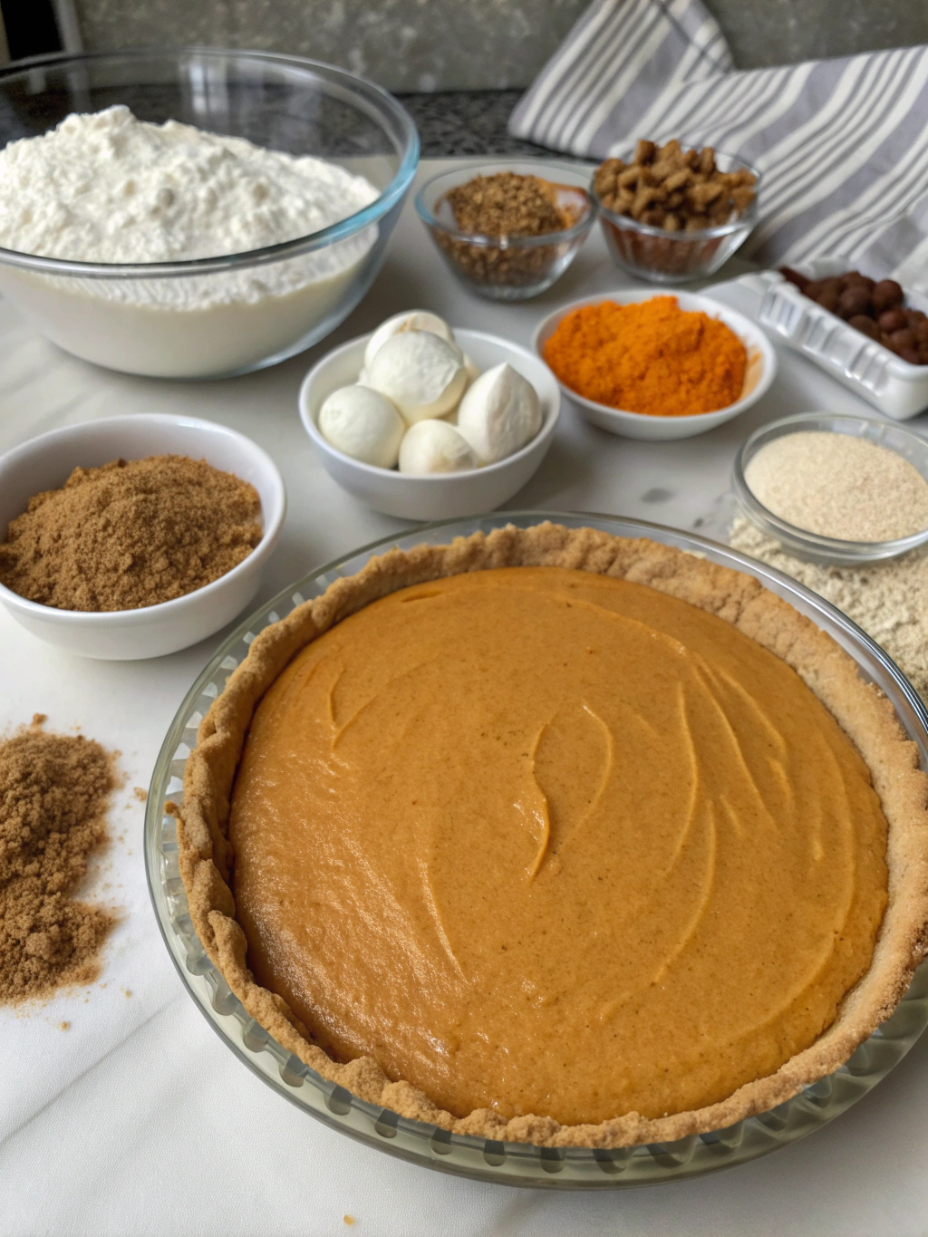 - In another bowl, whisk together pumpkin puree, brown sugar, eggs, and all spices until well combined. Slowly stir in the heavy cream until you achieve a silky-smooth consistency. Let this mixture sit for 5 minutes before using to allow the spices to bloom.