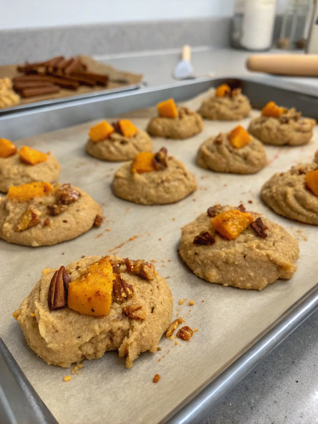 Gradually add the dry ingredients to the wet ingredients, mixing on low speed just until combined. Over-mixing activates gluten, which can make your cookies tough—stop as soon as no flour streaks remain. The dough will be softer than traditional cookie dough due to the pumpkin’s moisture content.