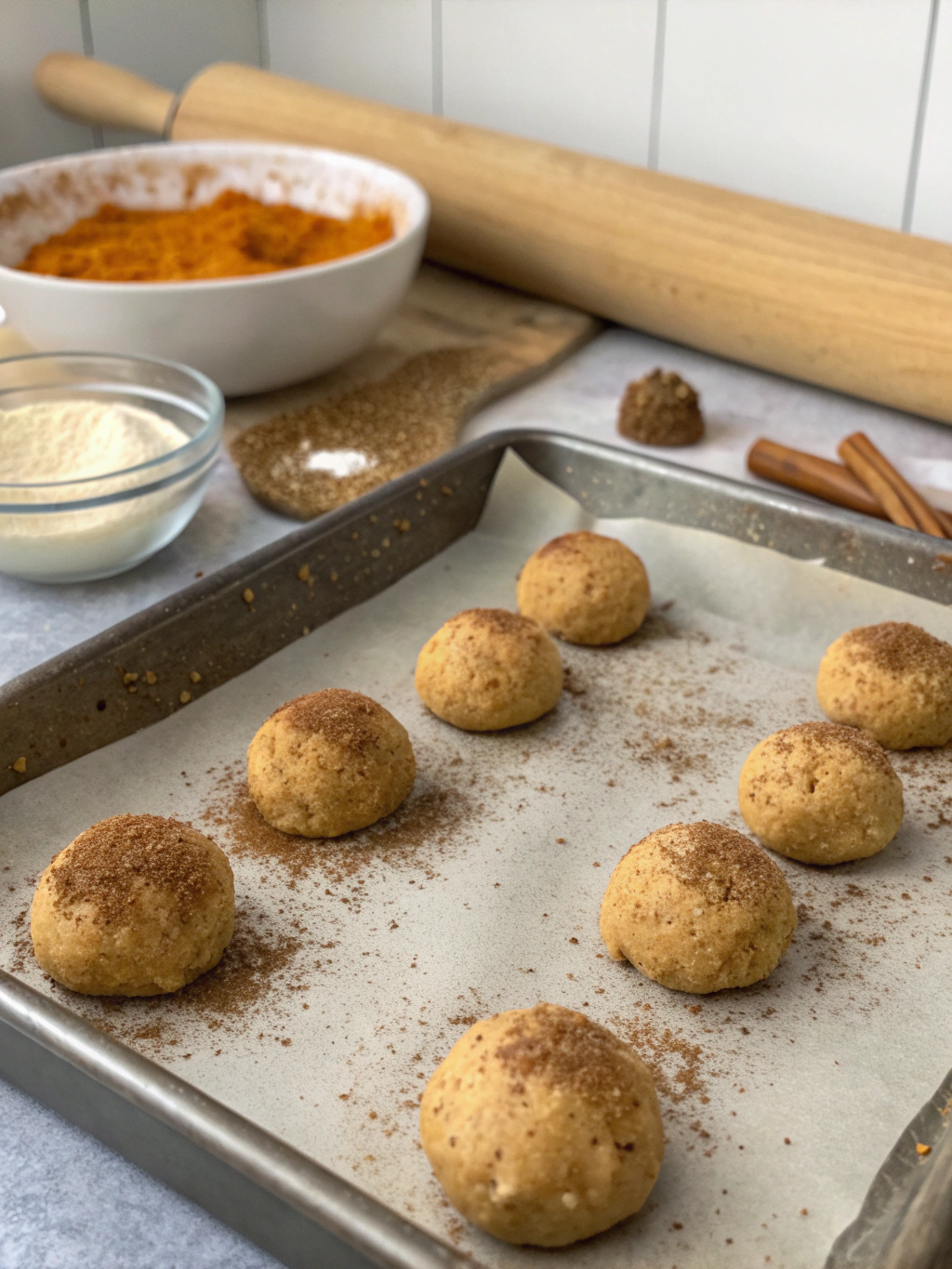 - Chilling time: 30 minutes (25% less than traditional snickerdoodles thanks to the pumpkin puree’s consistency)