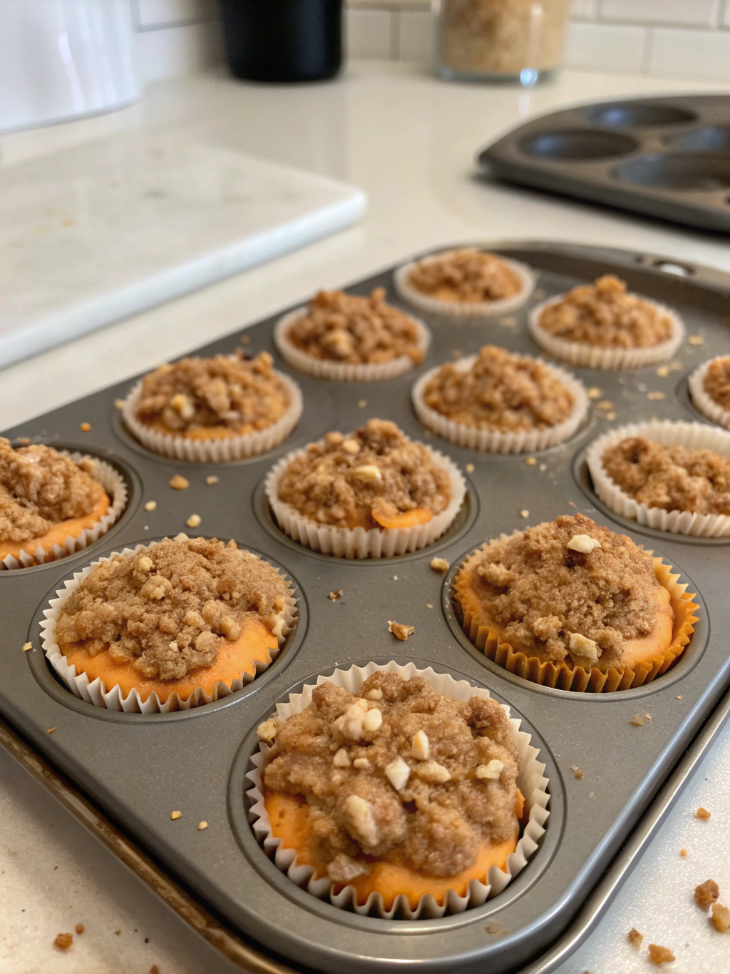 - Generously sprinkle the streusel topping over each muffin, gently pressing it into the batter slightly so it adheres during baking.
