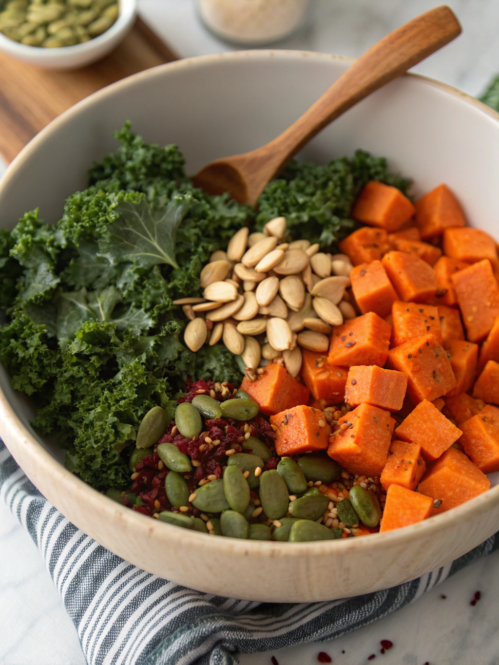 Start with a base of cooked grain if using, then arrange the roasted sweet potatoes and sautéed kale. Drizzle generously with tahini dressing and add your chosen toppings. The combination of textures—crunchy seeds, creamy avocado, and chewy sweet potatoes—creates a bowl that’s as satisfying as it is nutritious.