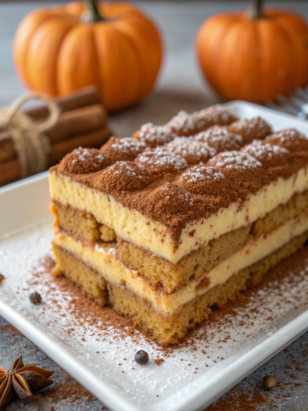 Serve this Spiced Pumpkin Tiramisu chilled, cutting into clean squares or scooping generous portions if using a trifle dish. For an elevated presentation: