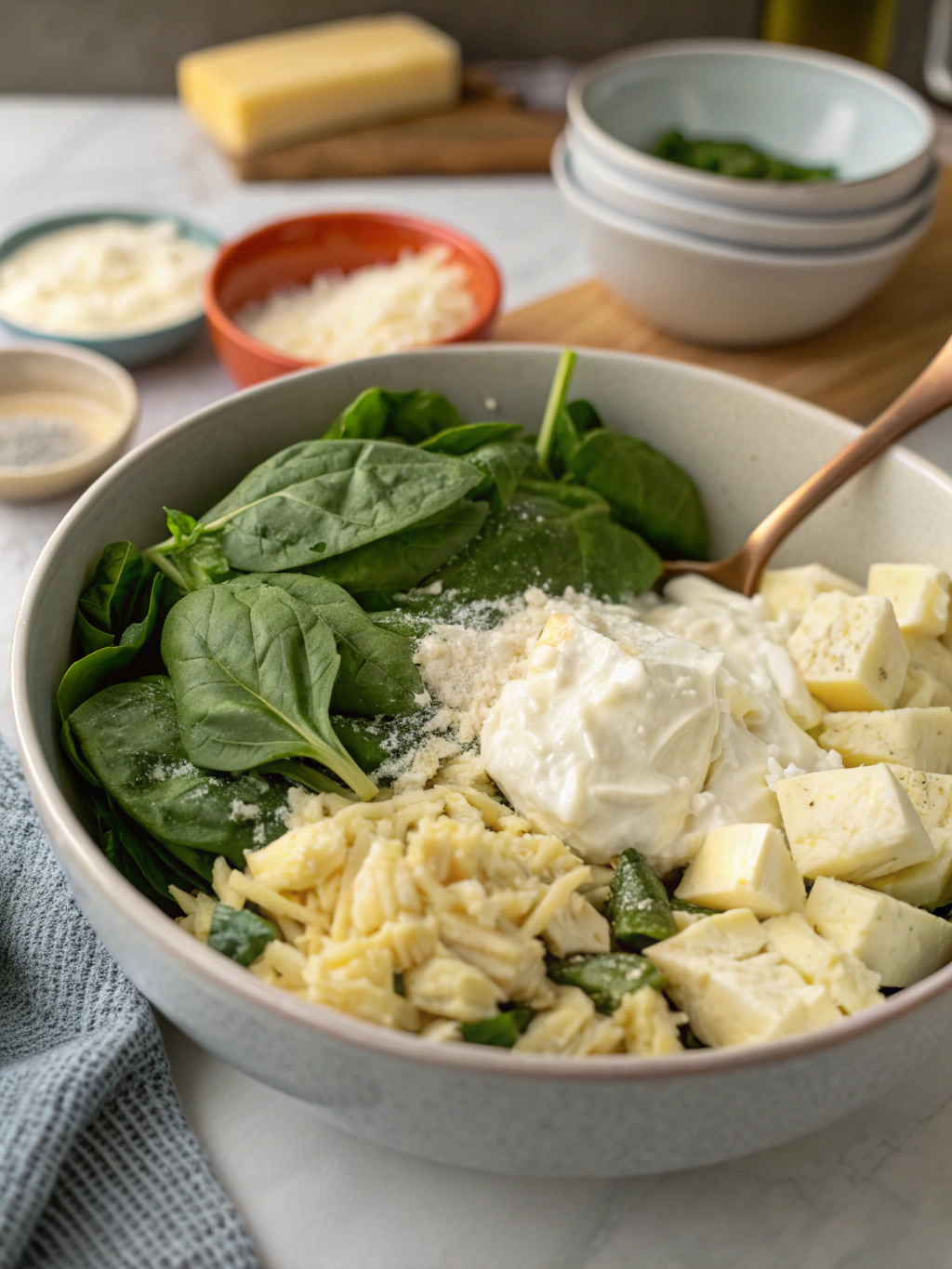 Drain artichoke hearts thoroughly and chop them into bite-sized pieces. The ideal texture includes some smaller pieces that blend into the dip and a few larger chunks for textural contrast. Add to the bowl with spinach.
