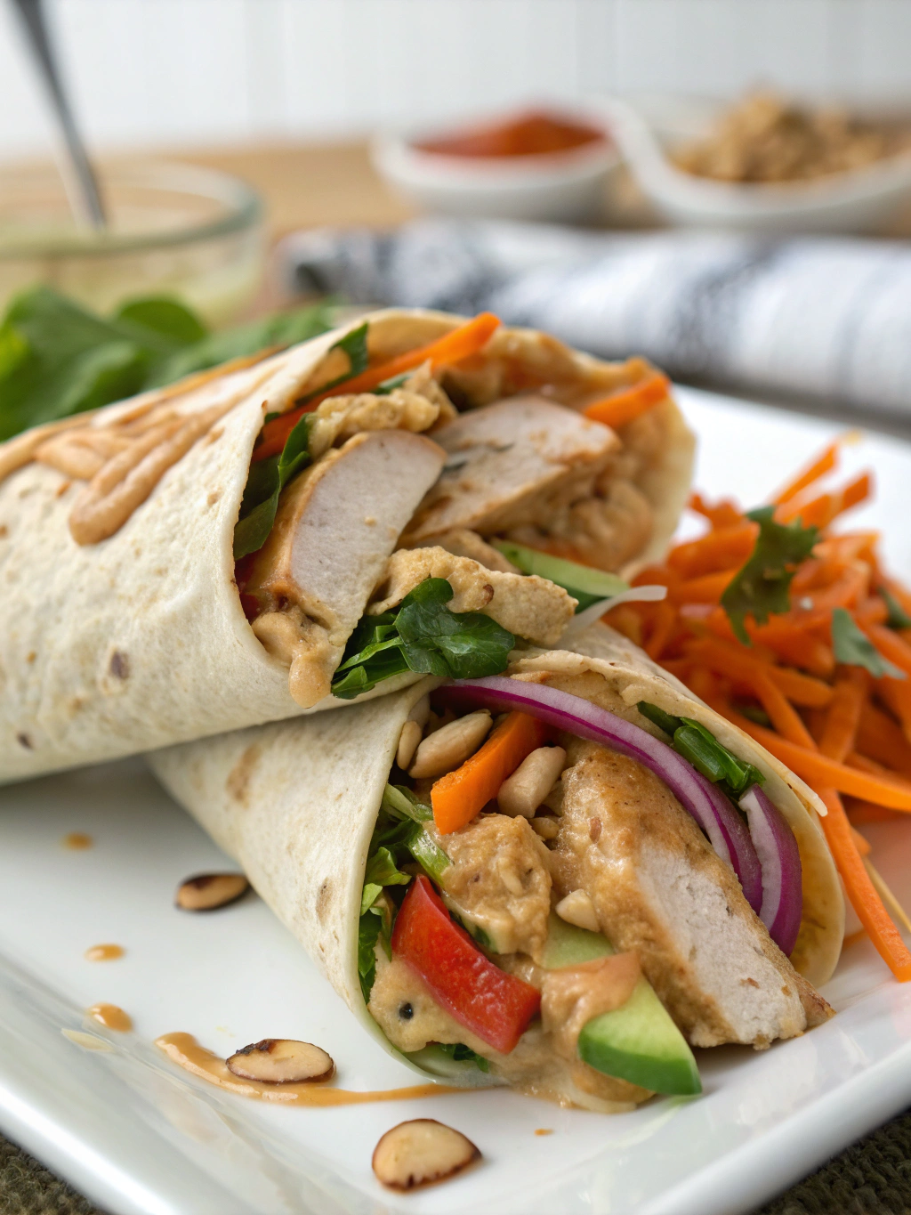 In a medium bowl, whisk together the peanut butter, soy sauce, rice vinegar, honey, lime juice, sesame oil, minced garlic, grated ginger, and sriracha. The mixture will be quite thick at first. Gradually add warm water, one tablespoon at a time, until you reach your desired consistency. For wraps, a slightly thicker sauce works well as it won’t make the tortilla soggy. Set aside about 2 tablespoons of the sauce for drizzling later.